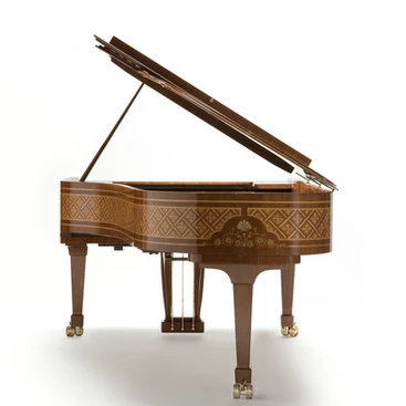 Looking into the details of the piano, we can see the intricate inlay of various wood, both natural and coloured, adding towards the grain of the walnut that precisely put together, not missing any details. The beauty of the wood is coupled with the precious mother-of-pearl details at the end of the four-petal bloom that adorned the side as well as the top of the lid of the piano. If the detailed woodworking is not enough for you, the extraordinary touch of color brings the instrument into a new height, with the addition of semi-precious stone, the Malachite.